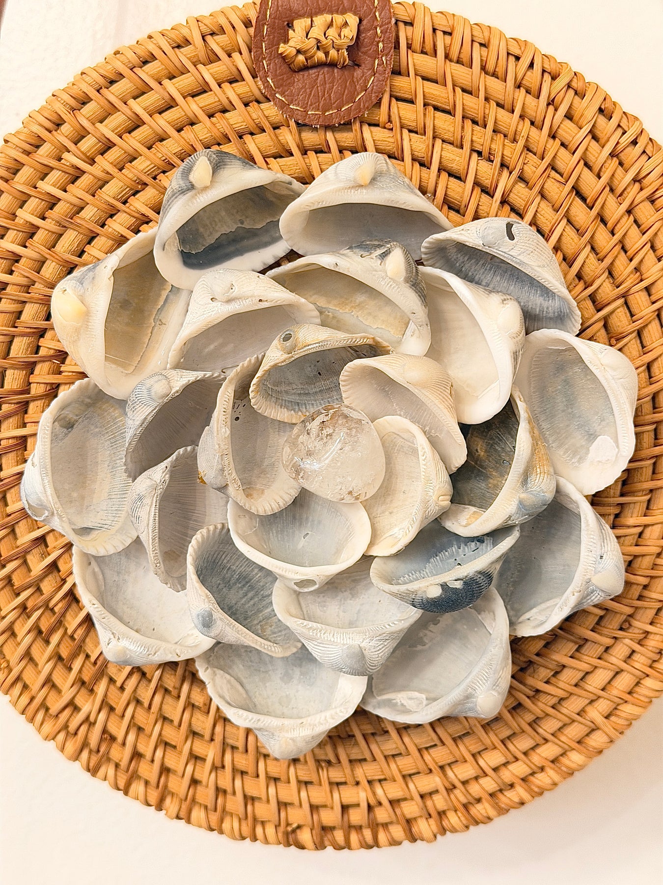 8 inch round rattan bag. Handmade with handpicked shells and a reiki-infused clear quartz crystal. Clear Quartz is considered to be the master healer, bringing alignment, clarity and manifestations.