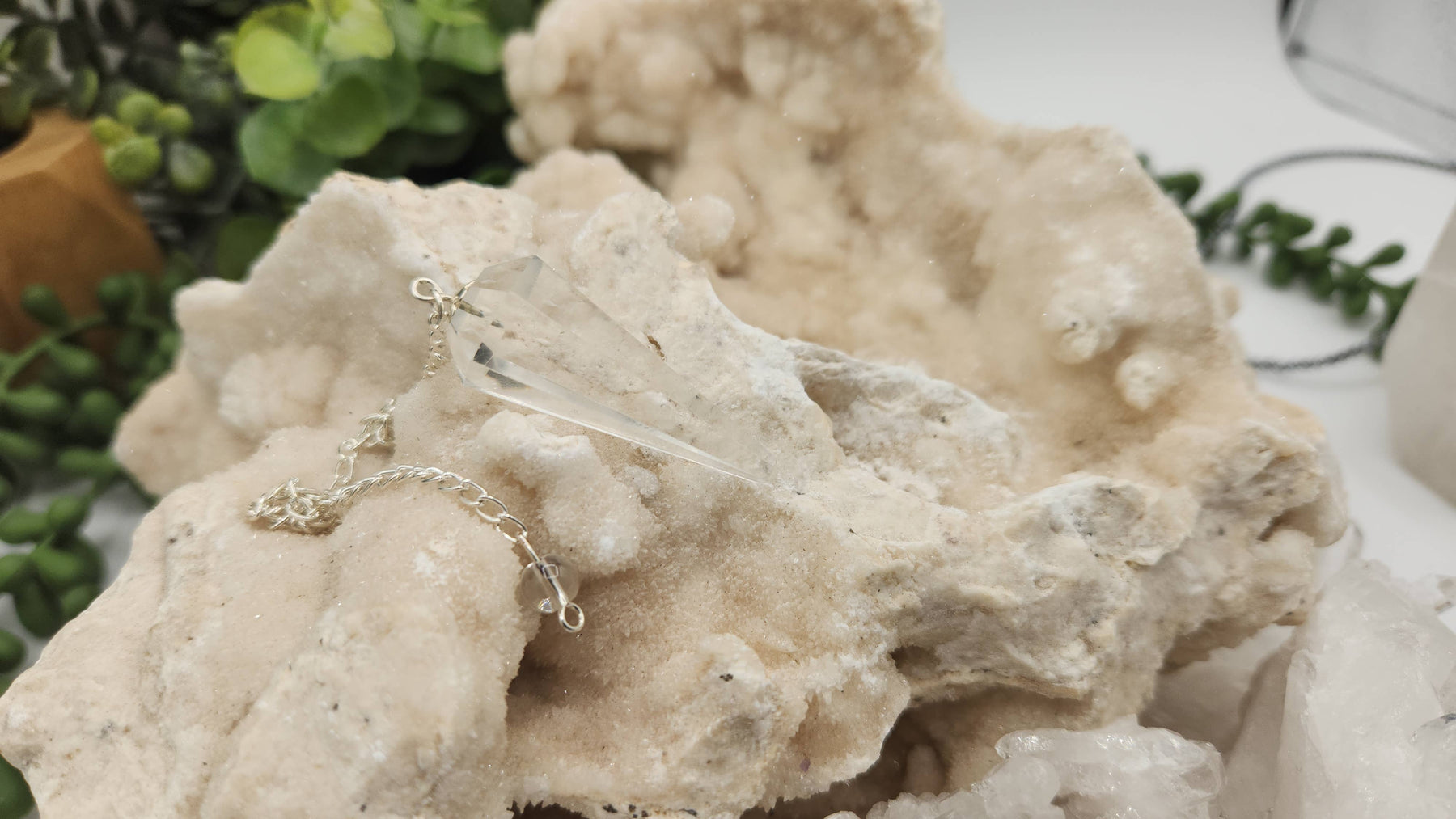 This stunning Clear Quartz is made with a silver color metal chain and a clear quartz sphere attached to the end.