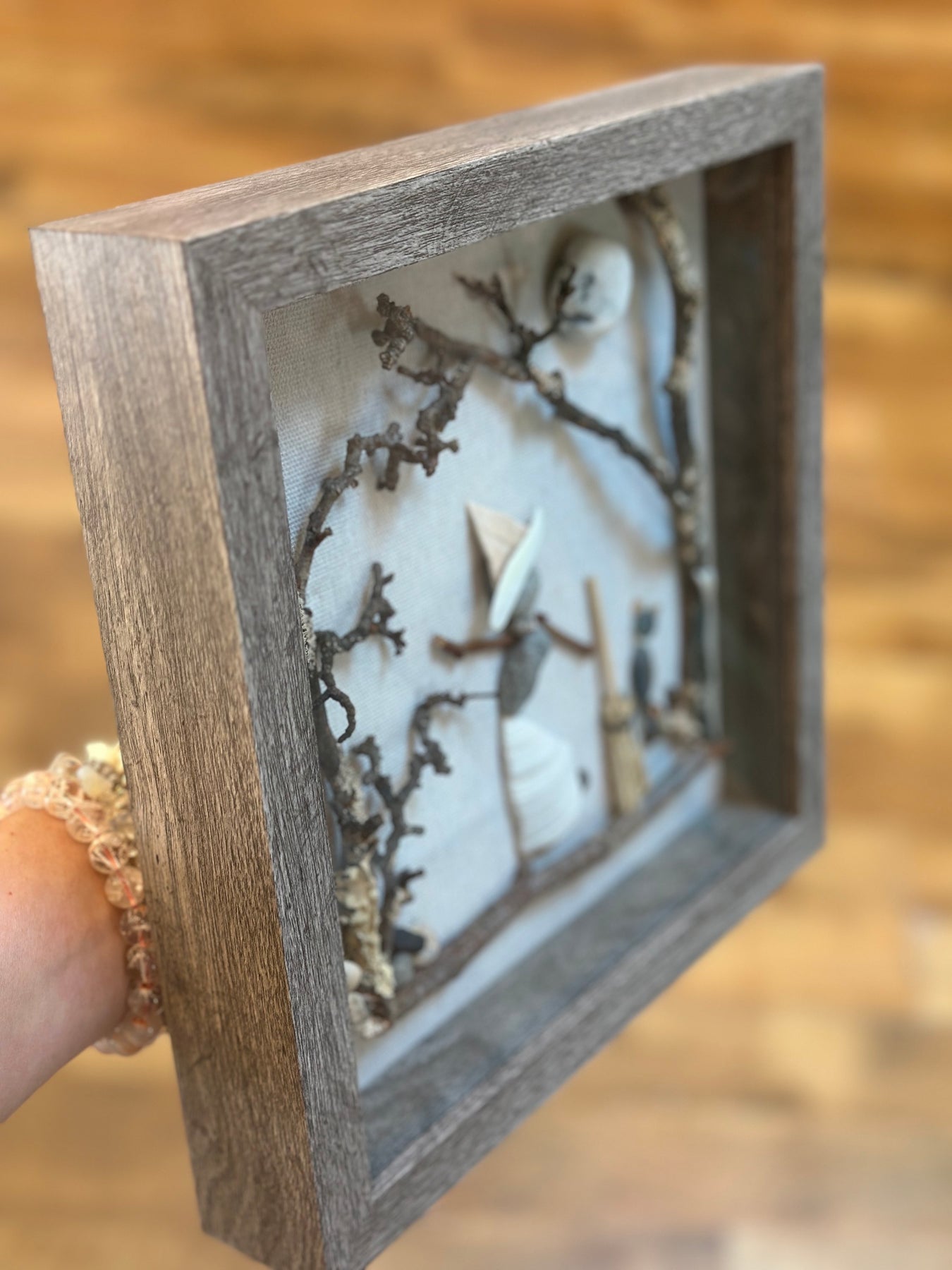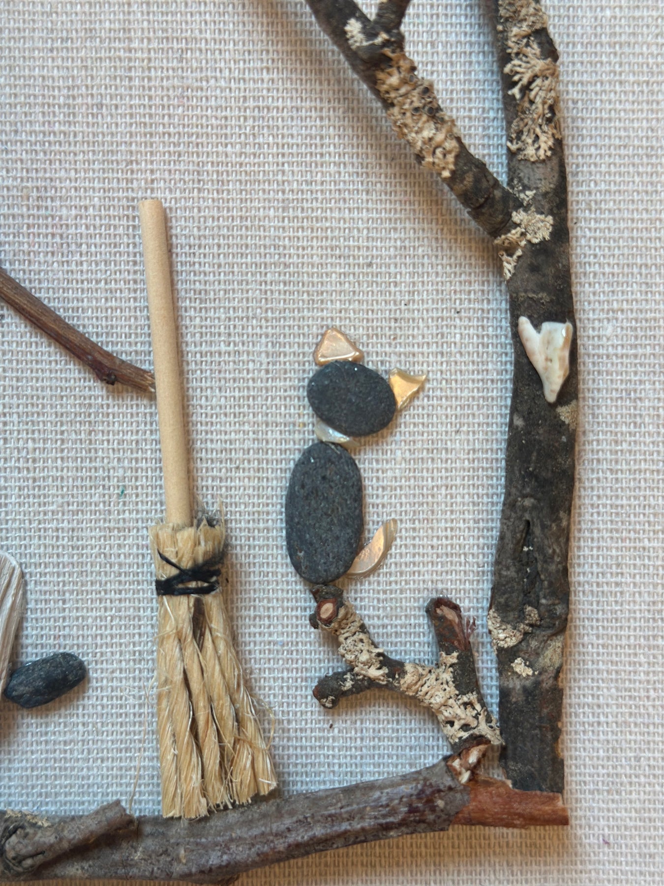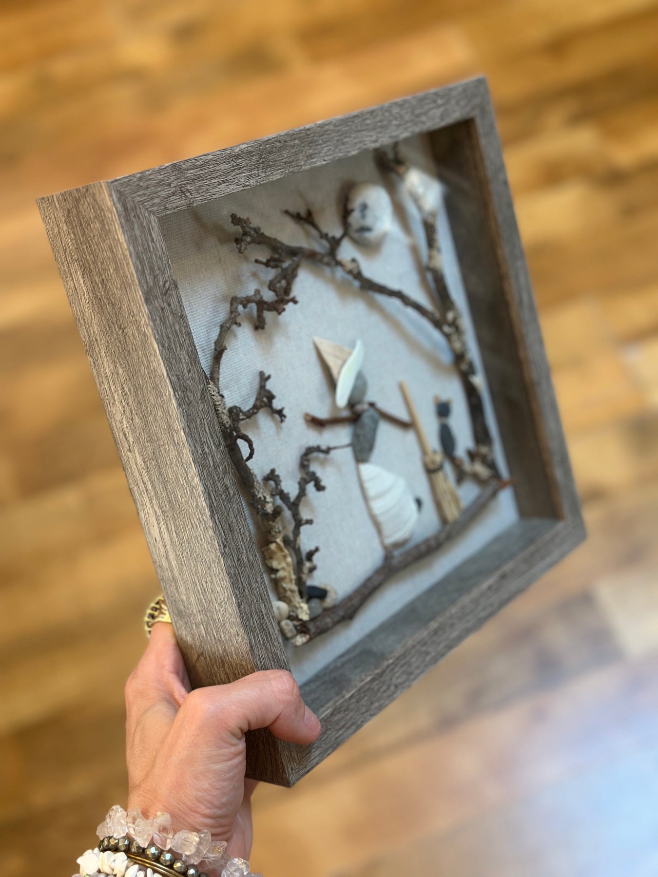 This dancing witch is made from handpicked rocks, shells and twigs and put in a 9x9 shadow box!