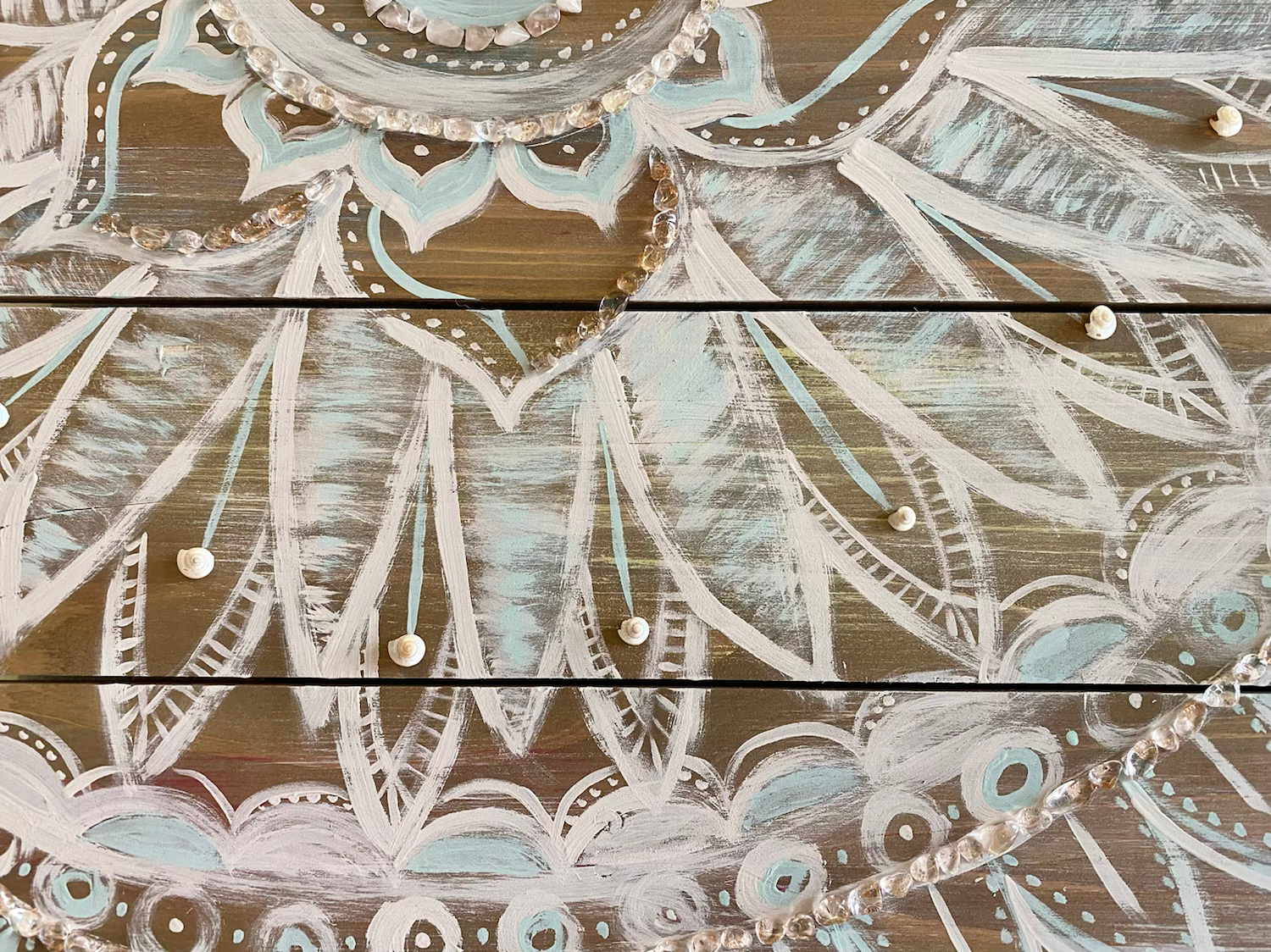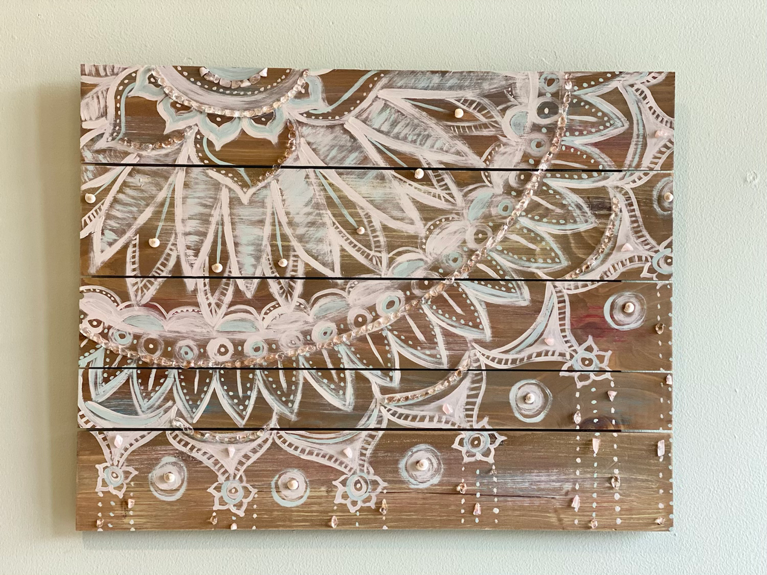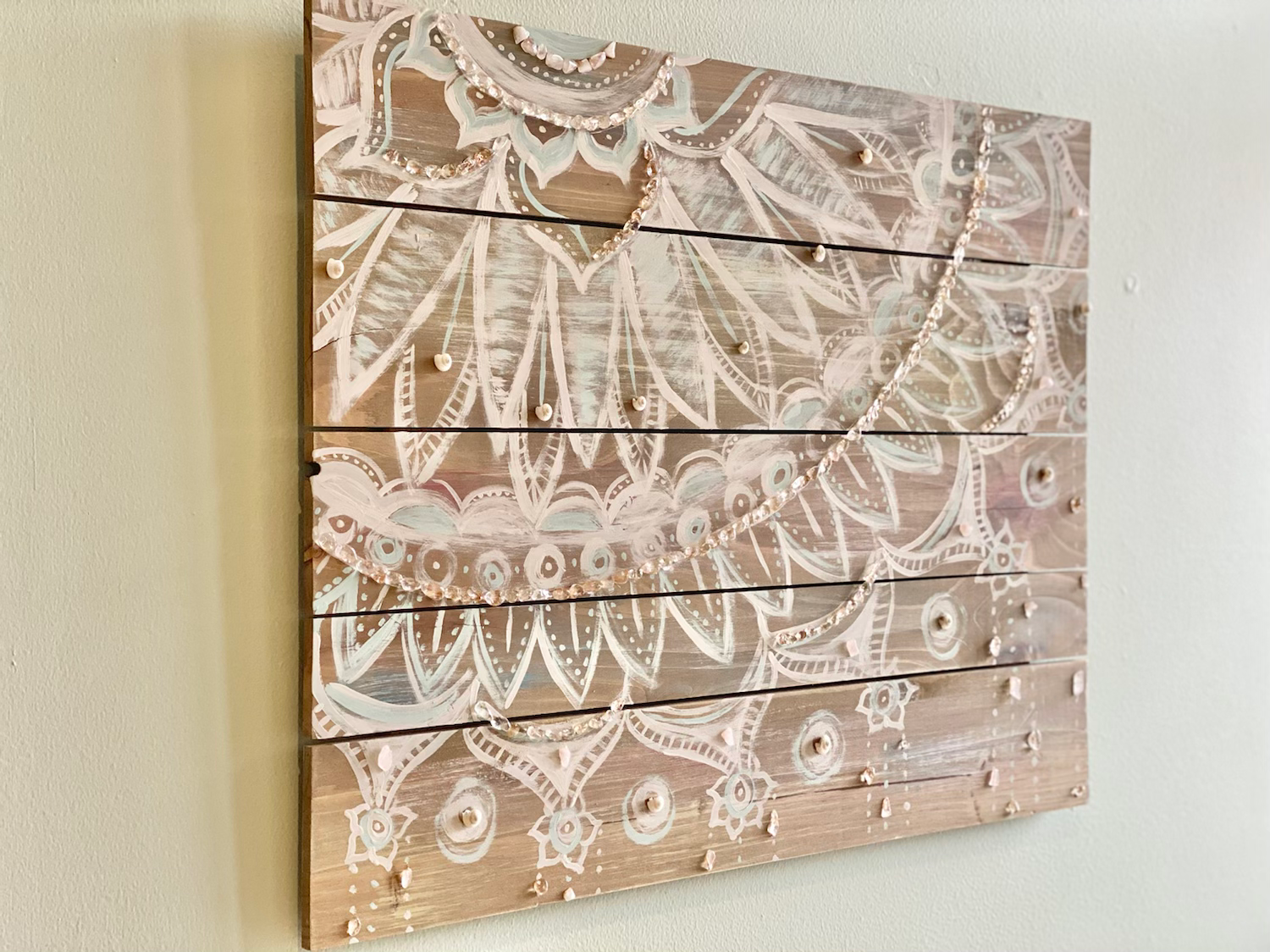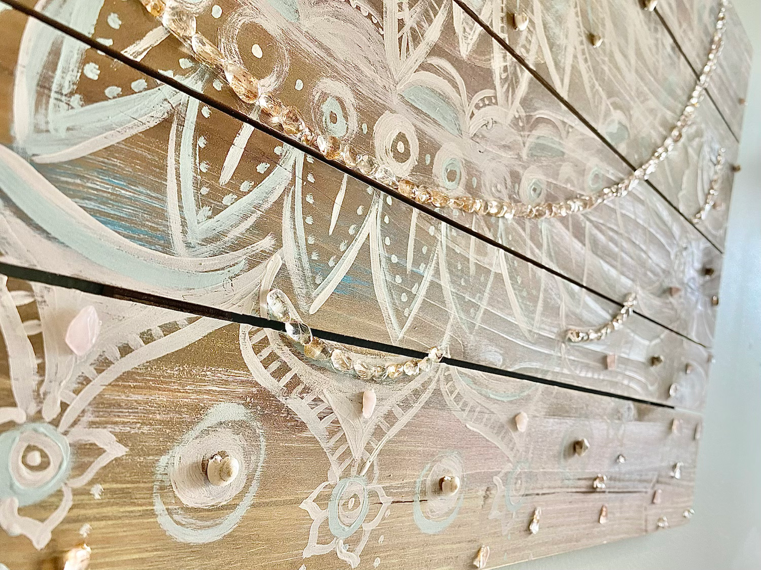 This radiant mandala was a vision that wouldn’t let go — a piece that called to be created until it finally came to life. Born of Love is hand-painted on wood panels in soft white and sea-glass green tones, adorned with handpicked shells and Reiki-infused Clear Quartz and Rose Quartz crystals.