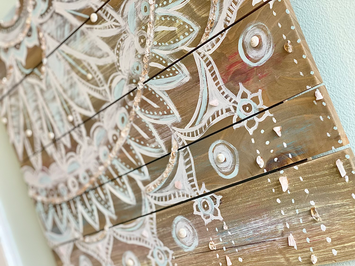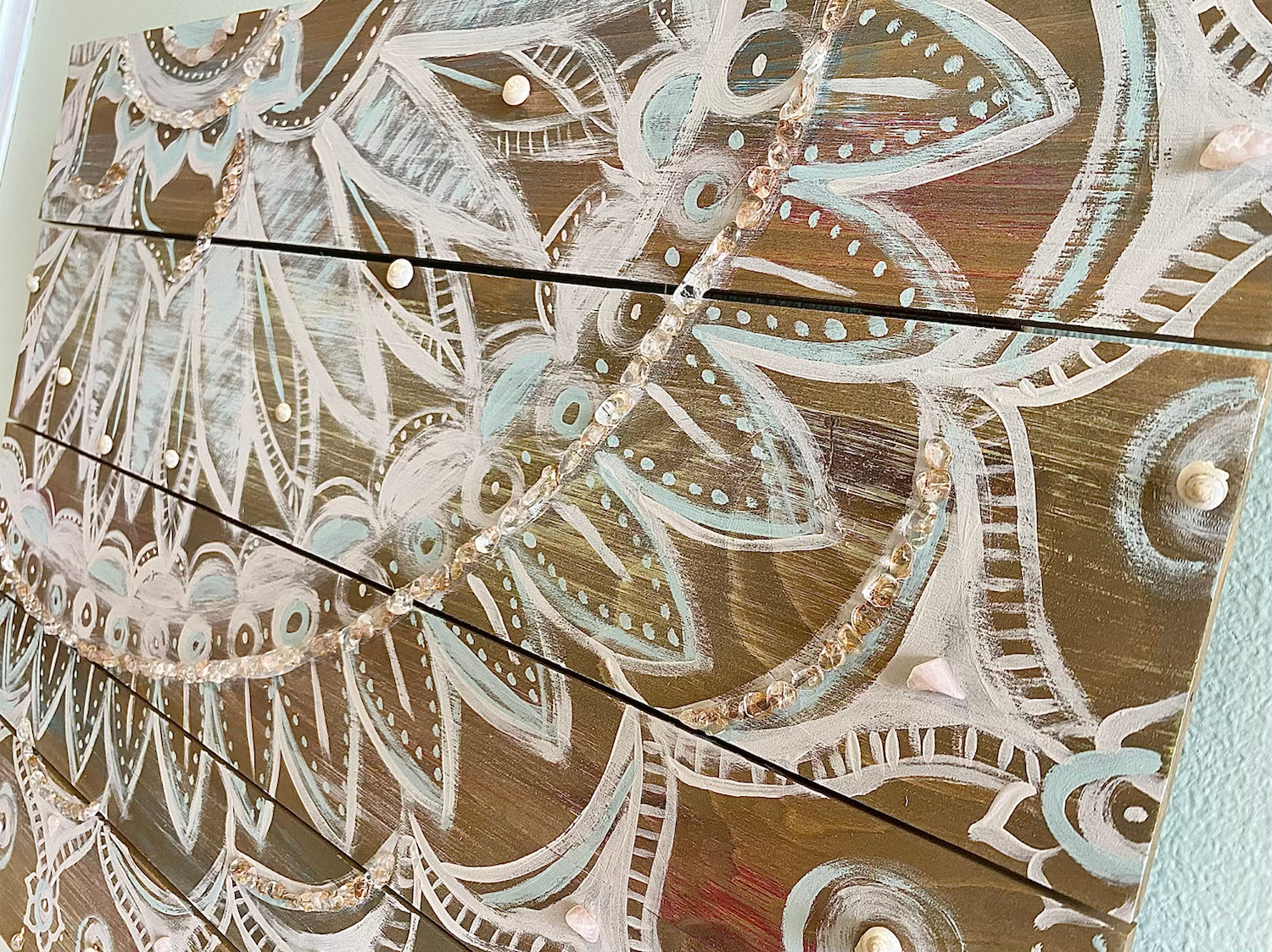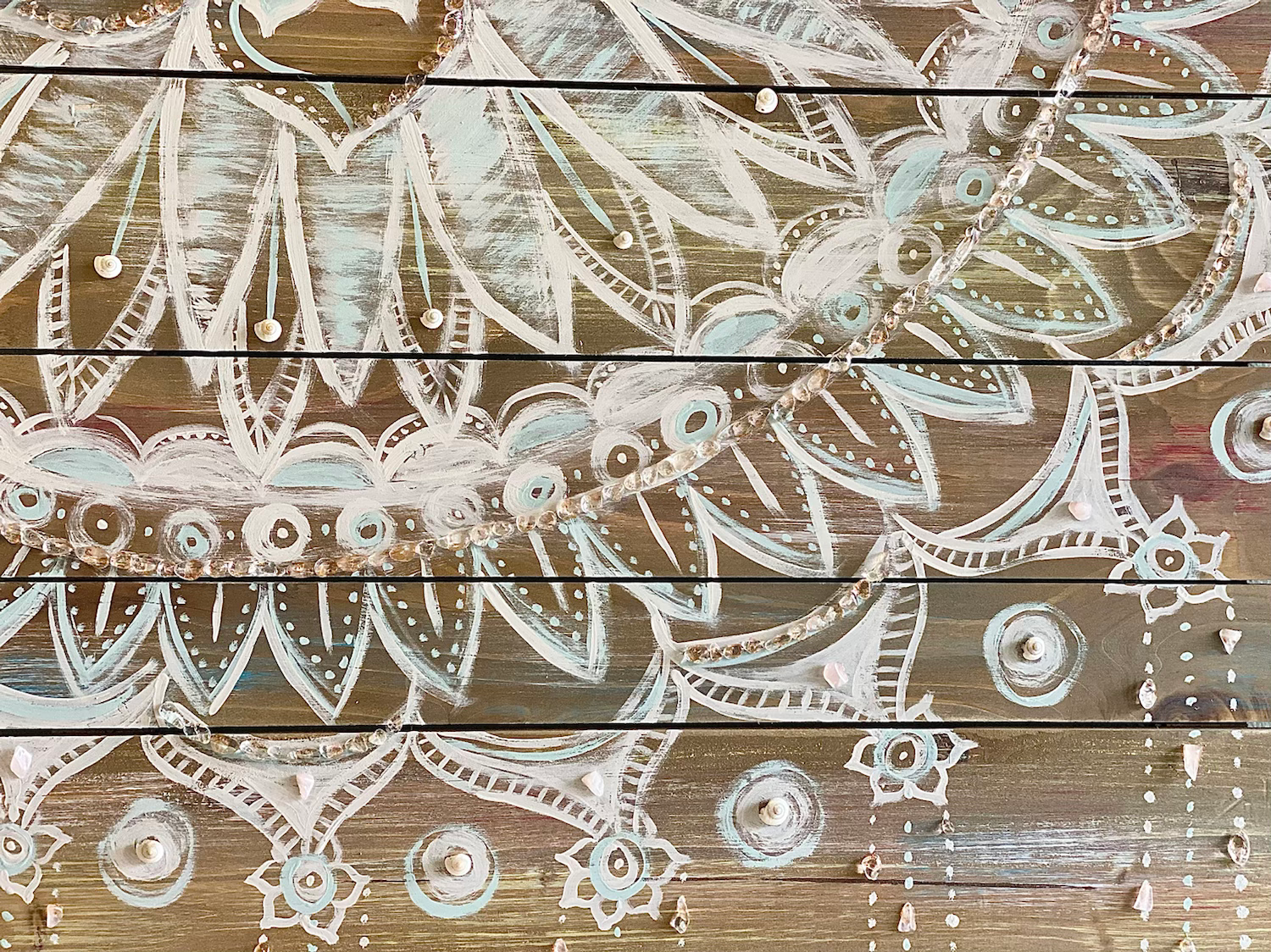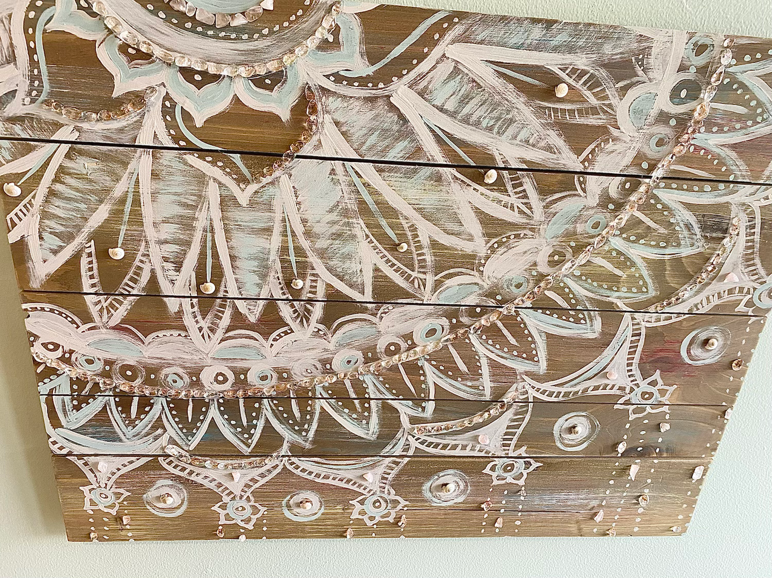 This radiant mandala was a vision that wouldn’t let go — a piece that called to be created until it finally came to life. Born of Love is hand-painted on wood panels in soft white and sea-glass green tones, adorned with handpicked shells and Reiki-infused Clear Quartz and Rose Quartz crystals.