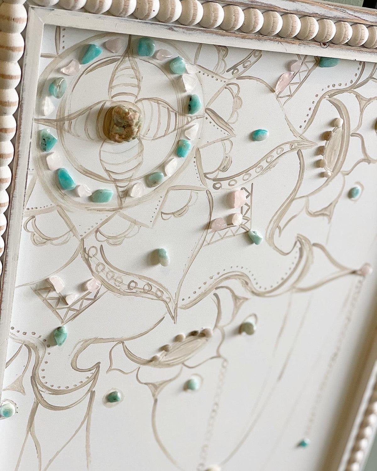 This one-of-a-kind piece was created intuitively — no set plan, just pure flow and joyful exploration. Mandala Flow is hand-painted and embellished with Reiki-infused Amazonite and Rose Quartz, along with handpicked natural stones that add texture, sparkle, and grounding energy.